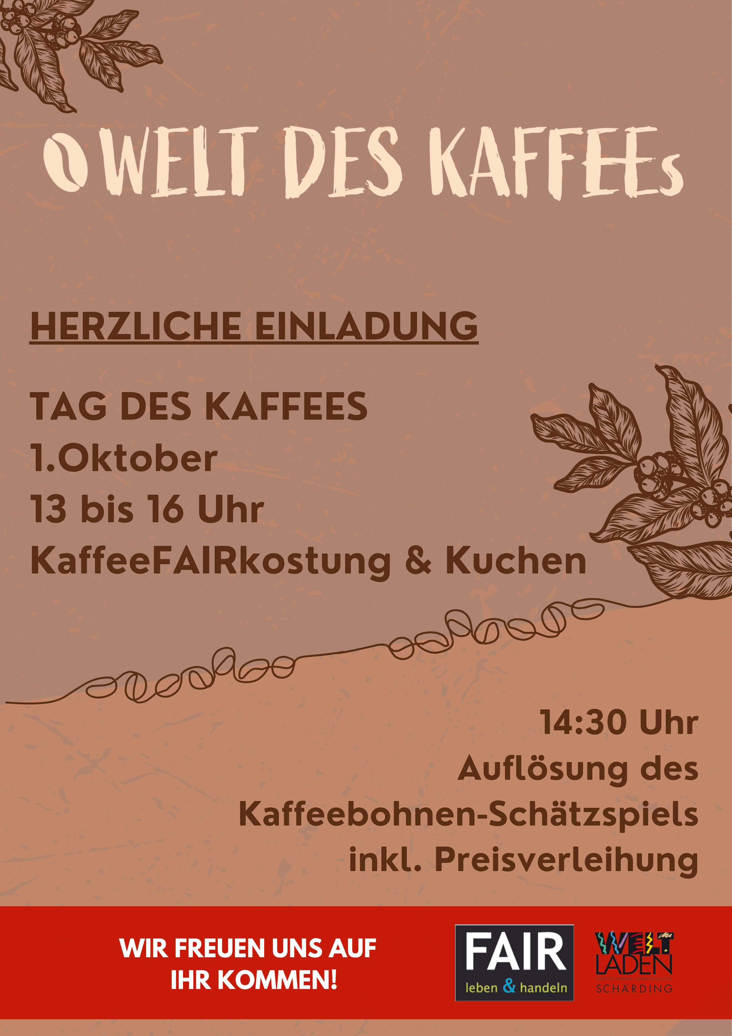 Am 1. Oktober, dem internationalen Tag des Kaffees, laden wir euch herzlich in den Weltladen Schärding ein. Von 13 bis 16 Uhr könnt ihr bei unserer KaffeeFAIRkostung fair gehandelten Kaffee mit Kuchen genießen und gleichzeitig den Abschluss der Ausstellung „Welt des Kaffees“ feiern. Um 14:30 Uhr lüften wir außerdem das Geheimnis des Kaffeebohnen-Schätzspiels. Kommt vorbei und verbringt einen genussvollen Nachmittag mit uns – wir freuen uns auf euch!